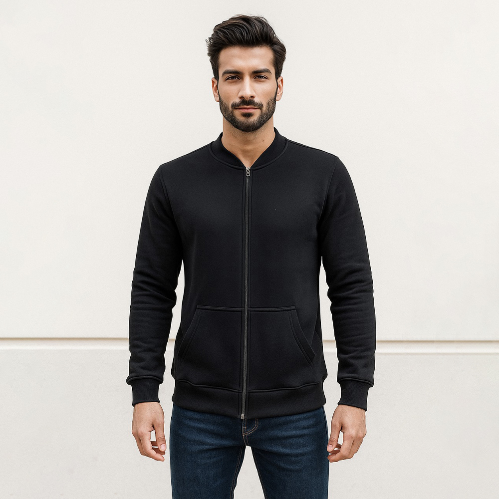 Stay warm and stylish with our Black Men’s Zipper Hoodies Wholesale USA, crafted for premium comfort and a timeless look. Designed with high-quality 300 GSM fleece fabric, this hoodie delivers superior warmth and softness for everyday wear. The full front zipper closure ensures easy layering, while the bomber-style ribbed collar adds a modern streetwear vibe that pairs well with any casual outfit.