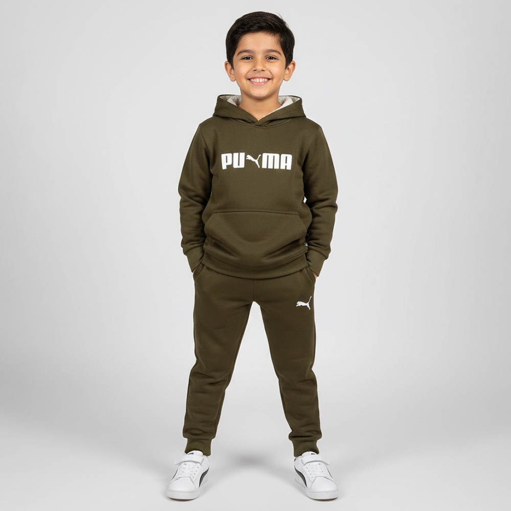 Made from soft and durable fleece fabric, this tracksuit provides excellent warmth without feeling heavy. The hoodie features a cozy sherpa-lined hood with a faux-shearling finish, adding extra insulation and comfort for chilly weather. A classic kangaroo pocket on the front allows kids to keep their hands warm or carry small essentials with ease.